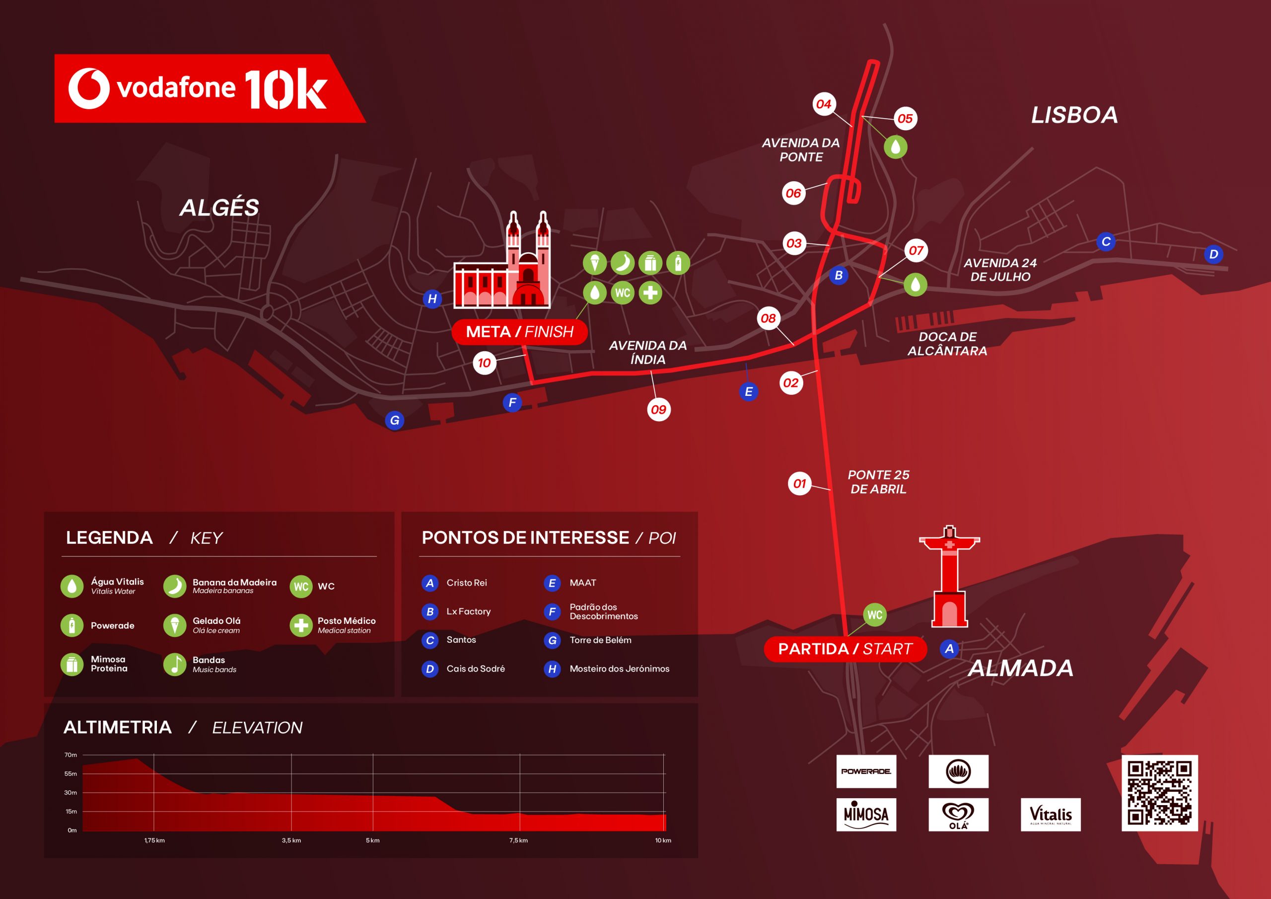 The Vodafone 10K has a very special course. It starts right at the beginning of the 25 de abril bridge and runs into the Lisbon riverside finishing at the historic Mosteiro dos Jerónimos.